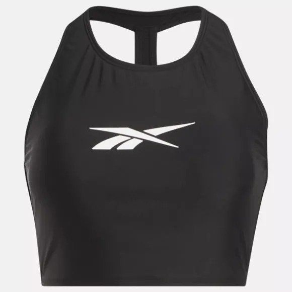 Mix up your beach look in this women’s Reebok swim top. It’s made of stretchy, quick-drying fabric and lined for comfort and coverage. A high neck gives it a sophisticated silhouette, and a racer back allows you to move freely through the water.